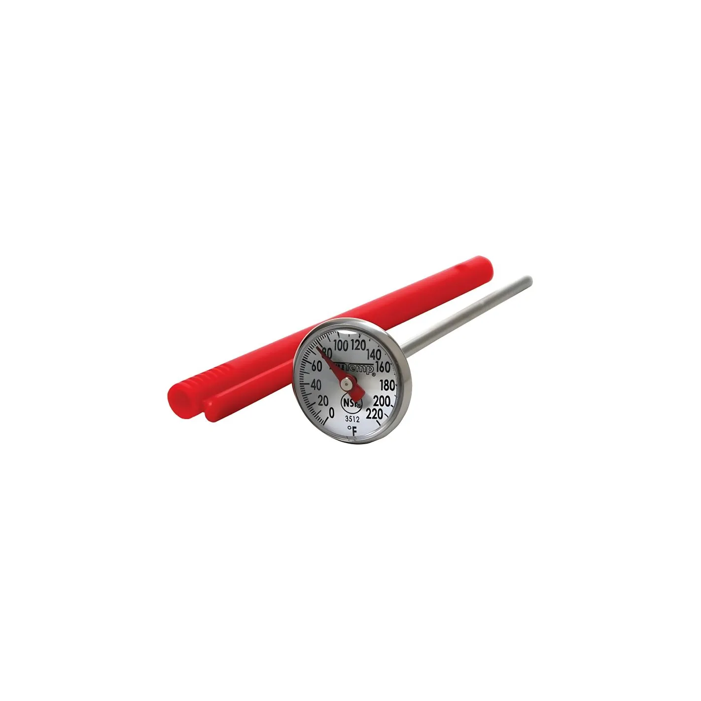 El termómetro de lectura instantánea de Taylor es la herramienta profesional para dar mayor precisión. Rastrea temperaturas de 0 °F a 220 °F y es fácil de leer con la lente de plástico de 1 pulgada y el puntero rojo. El termómetro de lectura instantánea es fácil de usar, versátil y perfecto para usos múltiples. La funda de bolsillo incluida también se puede usar como extensión del mango para proteger las manos del calor. No deje el termómetro en la parrilla o en el horno durante el proceso de cocción, ya que esto dañará la lente de plástico. Este termómetro es certificado NSF.