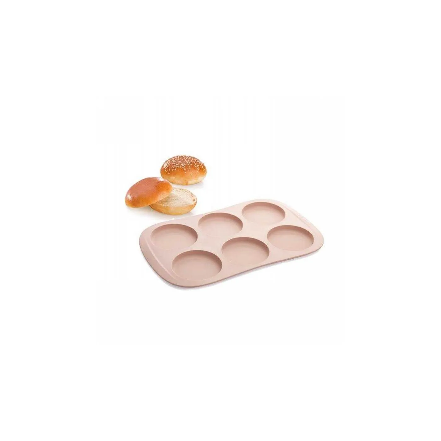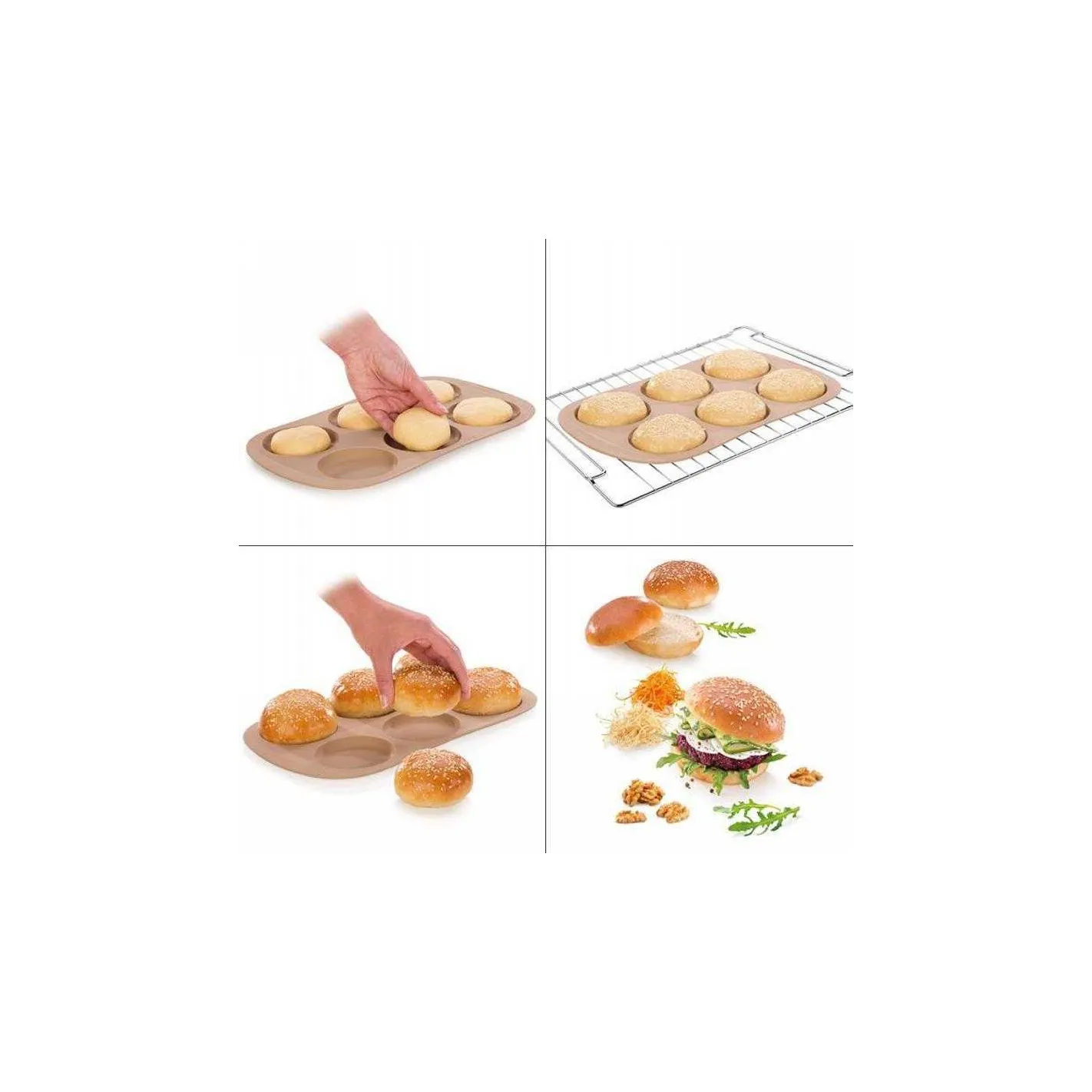 Ideal para los amantes de la cocina que desean preparar pan de hamburguesa casero con resultados uniformes y profesionales. Este molde permite hornear hasta seis panes a la vez, garantizando una textura esponjosa y una cocción uniforme, además de ser fácil de limpiar y almacenar.USO: BAKERY