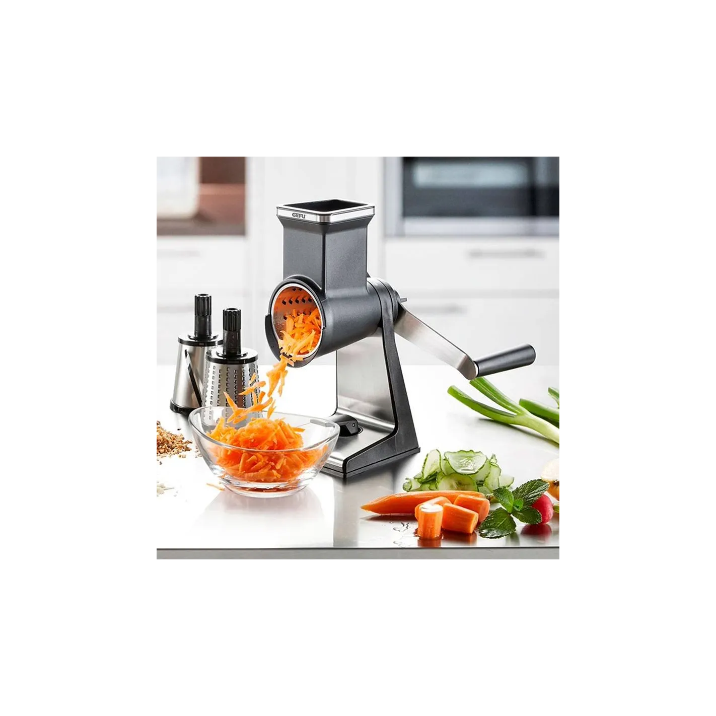 El Rallador de Tambor TRANSFORMA de GEFU es la herramienta ideal para quienes buscan eficiencia y precisión en la cocina. Equipado con tres tambores intercambiables LASER CUT extra afilados, permite realizar rallados finos, gruesos o cortes en rodajas delgadas, adaptándose a diversas necesidades culinarias.