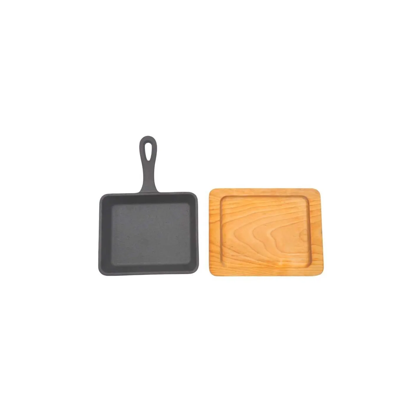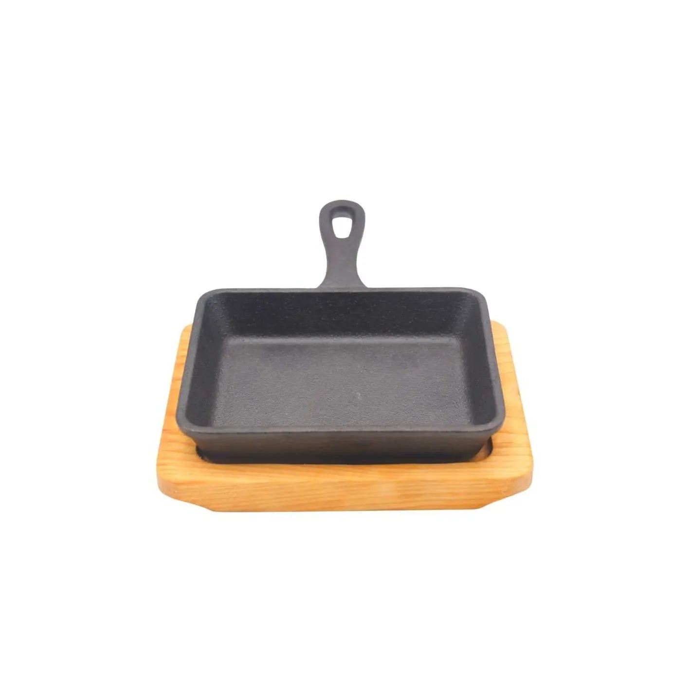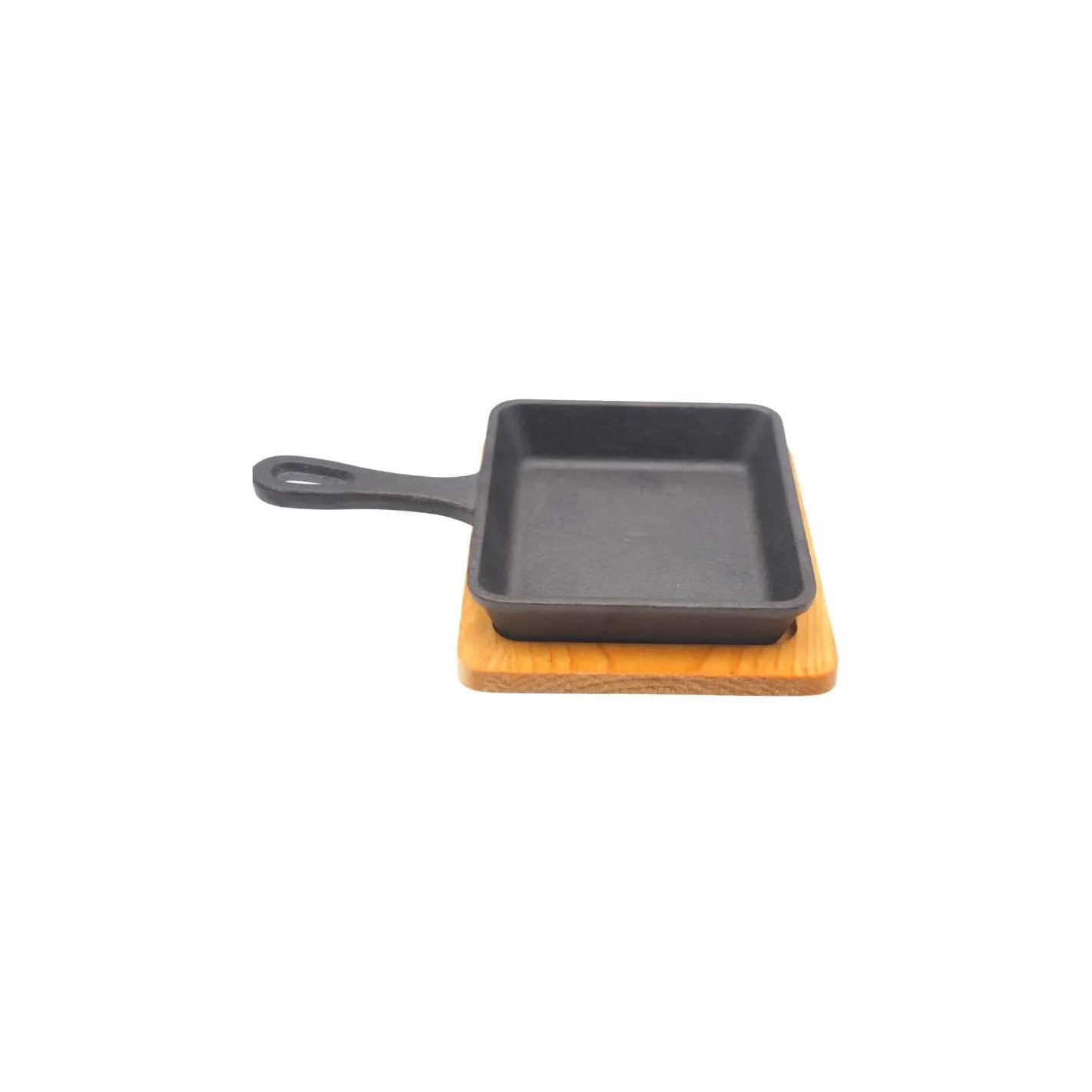 Una excelente adición a cualquier restaurante de carnes o establecimiento de servicio de alimentos, el mini sartén rectangular es perfecto para verduras a la parrilla y platos de carne. La plancha de hierro fundido incluida en este conjunto resistirá altas temperaturas y proporciona una excelente retención de calor. Gracias a su agarre y a la parte inferior de madera, su personal puede entregar de manera segura artículos calientes del menú a sus invitados.USO: DOMESTICO