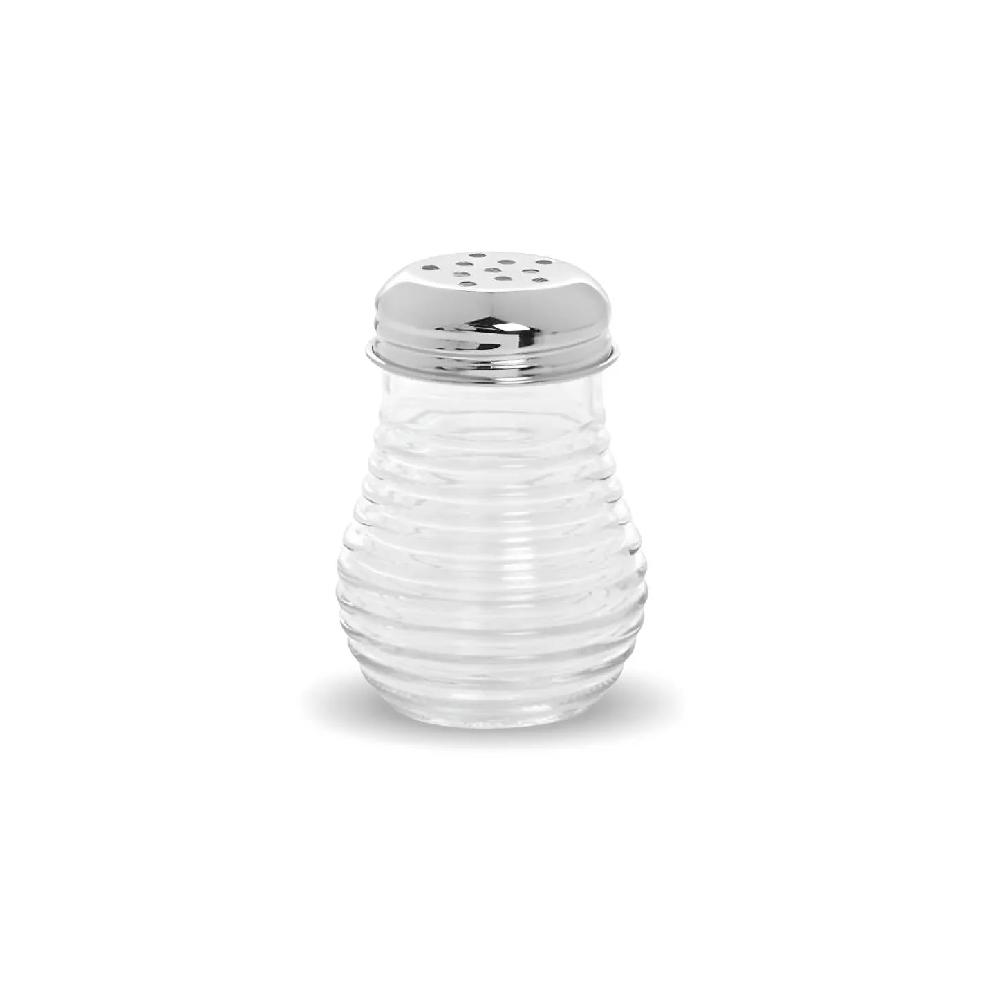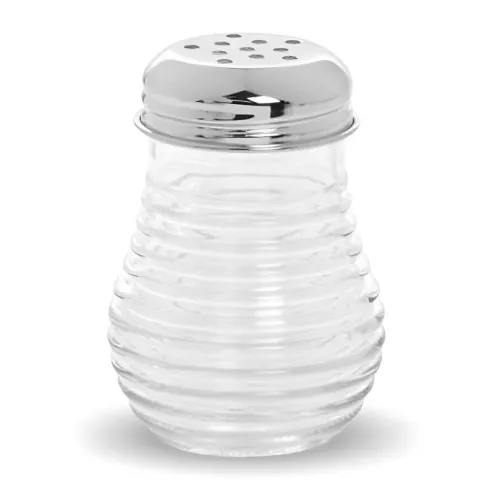La quesera está fabricada con vidrio de calidad apto para alimentos a nivel comercial y su tapa cromada y perforada ayuda a la distribución del queso en polvo. Cuenta con una capacidad de 6 onzas y su diseño es tipo colmena.