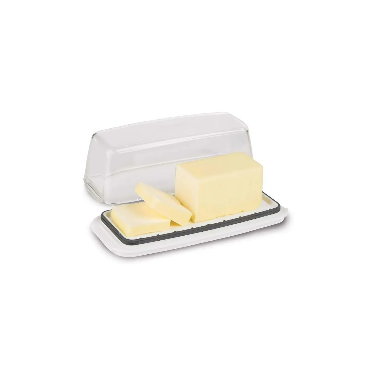 Tiene una tapa transparente con un sello de silicona en la base que crea un sello hermético que mantendrá la mantequilla fresca durante más tiempo. También cuenta con marcas de medición para barras cortas y largas de mantequilla de hasta 8 cucharadas. Se puede utilizar tanto dentro como fuera del refrigerador y es libre de BPA y apto para lavavajillas.