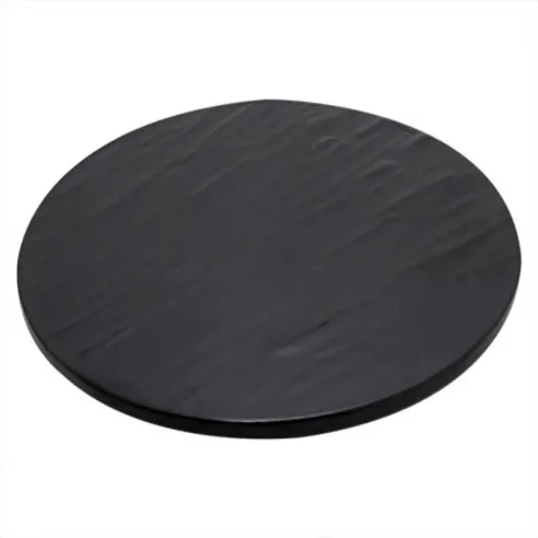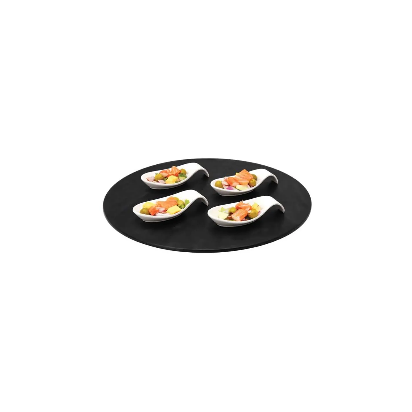 Estas bandejas de melamina son la manera perfecta de servir aperitivos, panes o acompañamientos para compartir con toda la mesa. La elegante bandeja redonda color negro de melamina es el color perfecto para enmarcar las artísticas creaciones culinarias de su chef. Además, su forma rrdonda y su elegante borde le dan un aspecto contemporáneo sobre otras bandejas.