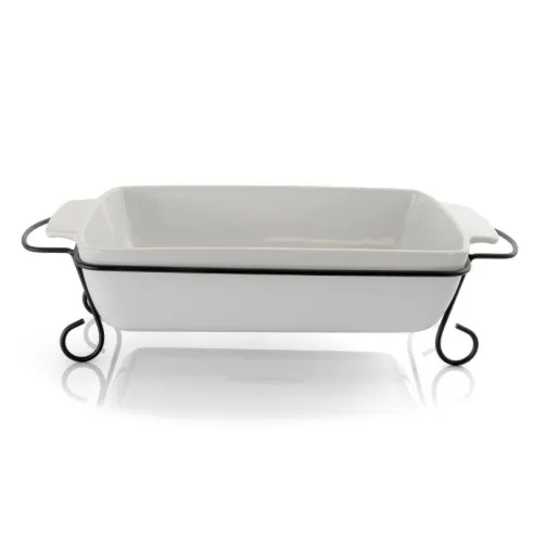Es apto para horno para que puedas cocinar y llevarlo directamente del horno a la mesa del comedor. Muestre su maravillosa comida con la rejilla de metal negro mate que mantiene el calor alejado de la superficie de la mesa. Sirva casi cualquier cosa que se le ocurra, desde tartas de durazno y strudel de manzana hasta tilapia al horno y pechugas de pollo rellenas.MATERIAL: CERAMICA