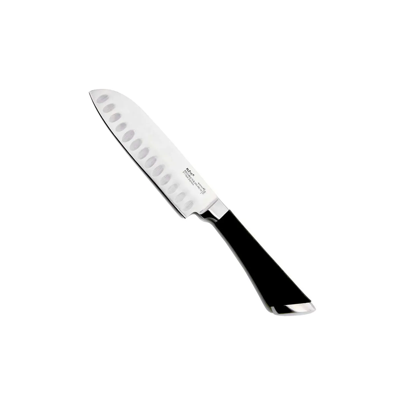 El cuchillo santoku de 5 pulgadas de Norpro está hecho de acero inoxidable de molibdeno vanadio con afilado cónico y hoja con acabado de piedra. Los huecos a cada lado de la cuchilla crean bolsas de aire, permitiendo que las rodajas caigan limpiamente. Doble refuerzo para un excelente equilibrio. Cómodo, ergonómico, agarre suave, mango antideslizante. Mango fabricado en plástico ABS. Se recomienda lavar a mano: nunca coloque cubiertos en el lavavajillas, ya que desafilará y astillará la cuchillaUSO: DOMESTICO