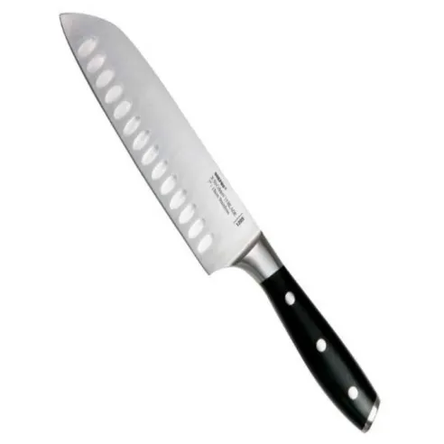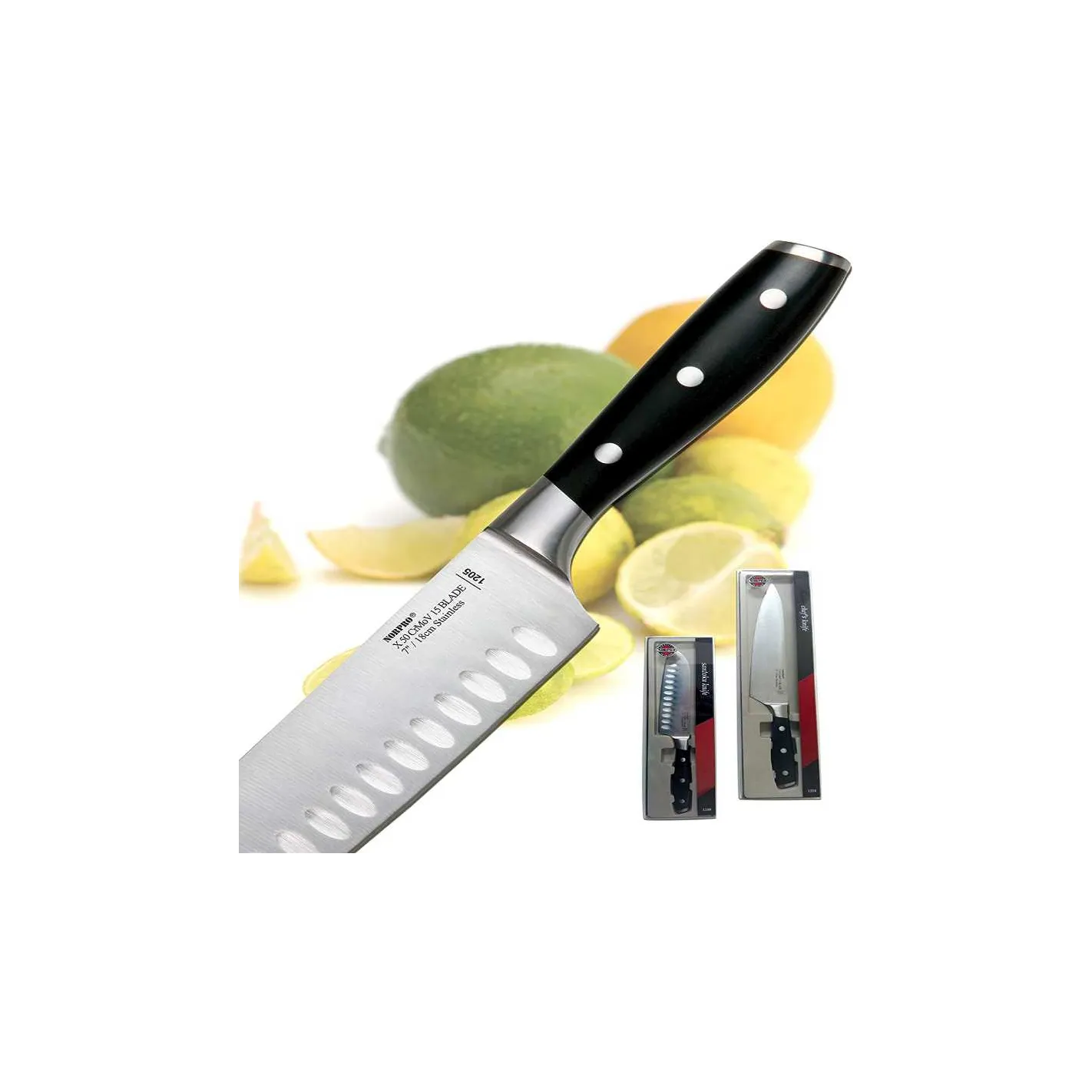 Cuchillo de cocina de estilo japonés diseñado para cortar, rebanar y cortar en cubitos, con hoja de acero inoxidable. Tiene cómodas asas sintéticas aseguradas con tres remaches. Su medidas de la hoja es de 7 pulgadas / 18 centímetros. Es el cuchillo ideal que tiene que estar en su cocina y asi tener cortes de gran calidad.